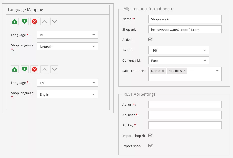 Mit der Multi-Shop-Variante steht in Pimcore ein eigenes Shop-Objekt zur Verfügung, in welchem für jeden Shop die notwendigen Zugänge und Konfigurationen hinterlegt werden. Neben den Zugangsdaten werden die Sprachen, die Verkaufskanäle (Sales Channels), die Steuersätze sowie die Währungen verwaltet. Im Rahmen der Konfiguration können Sie auch entscheiden, ob die Daten initial aus Shopware importiert werden und im Anschluss Pimcore das führende System für Produktdaten wird. Ebenfalls kann in diesem Objekt gesteuert werden, ob der Export in Richtung Shopware 6 statt findet.