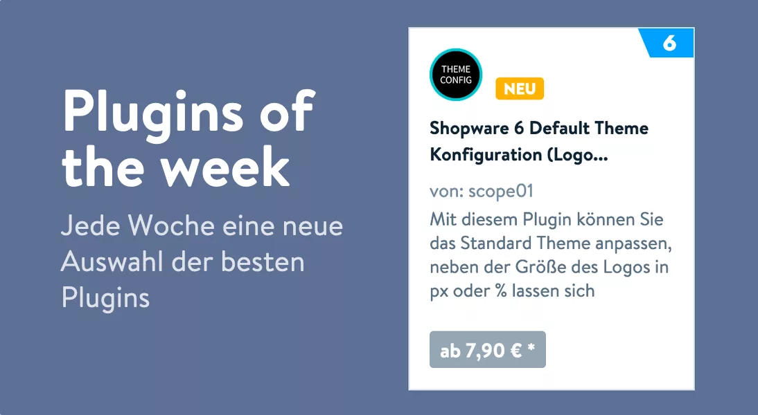 Unser neues Plugin Shopware 6 Default Theme Konfiguration ist ein Shopware Plugin of the week. Dazu wählt der Hersteller der Onlineshop Software aus Schöppingen jede Woche Shopware Plugins aus, die besonderen Anforderungen entsprechen. So muss das Plugin für die neueste Version Shopware 6 entwickelt sein. Darüber hinaus muss es einen Mehrwert bieten und den Qualitätsanforderungen entsprechen. Schließlich muss das Plugin in Deutsch und Englisch verfügbar sein.